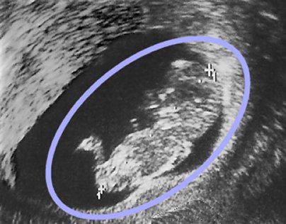Tento sonogram pořízený ve třetím měsíci těhotenství ukazuje mužský plod (hlavu, tělo a nohy je možné jasně rozeznat uvnitř modrého oválu).