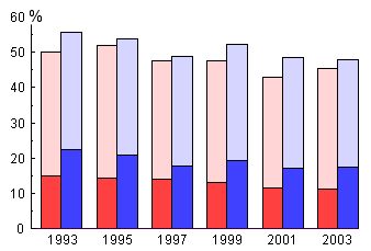 (ženy: cca. 15% - cca. 11%, muži: cca.