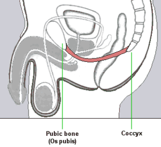 je má strukturu jako houpací síť. Rozkládá se od kosti stydké v předu po kostrč vzadu |