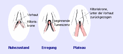 Mit steigender sexueller Erregung zieht sich die Klitoriskrone unter ihre Vorhaut zurück.