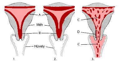 Mutatók: A. Endometrium B. Nyákcsepp a méhnyakban C. Az endometrium lebomlik és kilökődik D. A méhnyak megnyílik és a nyákcsepp kilökődik.