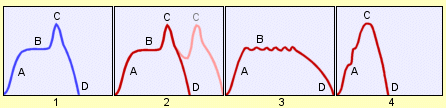 1. A férfi szexuális reagálása egyszerű mintát követ: a felizgulási fázistól (A) a platófázison (B) és az orgazmuson (C) át az elernyedésig (D). 2. A nő szexuális reagálása rendszerint hasonló mintát követ (vörös) , de az elernyedés előtt még további orgazmusok következhetnek (rózsaszín). 3. A nőknél a platófázis jóval hosszabb lehet anélkül, hogy orgazmus következne, de 4. előfordulhat rendkívül gyors orgazmus, s aztán éppolyan gyors elernyedés is.