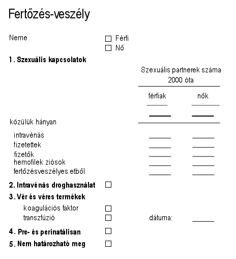 A HIV antitest teszteket bizalmasan lehet kérni egy orvosi rendelőben, s számos országban és városban anonim módon is el lehet végeztetni a különböző vizsgáló helyeken. Egy ilyen teszt előtt mindenkinek szakértő tanácsot kell kapnia. Pozitiv teszteredmény esetén az orvosi kutatást is segíteniük kell a megbízható statisztika érdekében. Egészségvédelmi célra a teszteredmény csak akkor alkalmas, ha az illető tudja, hogyan szerezte be a virust. A pozitiv teszteredményű egyénnek ezért meg kell próbálnia visszaemlékezni, hogyan történhetett a fertőzés. Ez teszi lehetővé, hogy az orvos kitöltse a megfelelő, bizalmas (sőt, gyakran névtelen) kérdőívet, amilyen az alábbiakban következik. (Vegyük figyelembe, hogy a nyomtatvány mellőzi az olyan kifejezéseket, mint „homoszexuális”, „heteroszexuális”, „biszexuális”, hogy ne sztereotipizálja a válaszadót és kerülje az előítéleteket.)