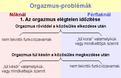 Orgazmus-problémák - Az orgazmus időzítésének zavarai Nőknél és férfiaknál egyaránt gyakori, hogy elégedetlenek az orgazmus időzítésével. Mindketten érezhetik például, hogy a közösülés során a férfi orgazmusa túl korán jön, vagy pedig a nőé jön túl későn. Ez nyilván szubjektiv ítélet. Mindenesetre egy gyorsan orgazáló nőt nem tekintenek diszfunkcionálisnak, s ugyanígy egy lassan orgazáló férfit sem. Épp ellenkezőleg: mindkettőt kiváló szexuális reagálónak tartják.