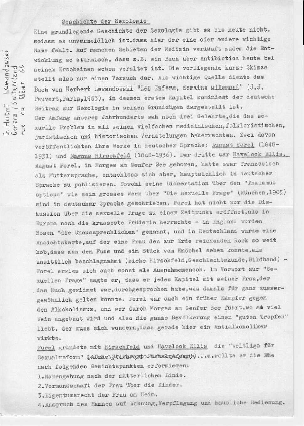 6. First page of an unpublished manuscript by Herbert Lewandowski "The History of Sexology". The ms runs to a total of 13 pages. [715K]