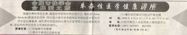 Hefei hat etwa 1 Mio. Einwohner (weitere 4 Mio. im unmittelbaren Einzugsgebiet) und ist die Hauptstadt der Provinz Anhui. Es ist eine schöne Stadt mit einem Ring von Parks, die den eigentlichen Stadtkern umgeben. Auch hier sah man große Bauprojekte zur weiteren Modernisierung und elegante neue Hotels nach bestem westlichen Standard. In einem dieser Hotels an einer großen Einkaufsstraße wurde ich untergebracht. Mein Hauptgastgeber war ein Arzt, Dr. Li Ze You, der in der Innenstadt eine sexologische Klinik betrieb. Sie war u.a. auch eine offizielle Klinik des Roten Kreuzes, wurde aber ganz privatwirtschaftlich betrieben. Eine Besichtigung machte mir klar, daß die Arbeit hier keineswegs ein Verlustgeschäft war. Auf mehreren Etagen wurde alles geboten, was irgendwie sexualmedizinisch relevant sein konnte: Empfängnisverhütung, Infertilitätsbehandlung, STD-Behandlung und Beratung, chirurgische, medikamentöse und psychotherapeutische Therapie sexueller Störungen. Es wurden sowohl westliche wie traditionell chinesische medizinische Verfahren angewandt. Überall herrschte große Geschäftigkeit. Dr. Li hatte aber auch gute Beziehungen zur Universität und dort für mich einen Vortrag in der neuen Psychiatrischen Klinik organisiert. Am Morgen des 8. September hielt ich also im sehr modernen psychiatrischen Hörsaal vor etwa 100 Professoren und Ärzten einen 90-minütigen Vortrag über "Sexuelle Funktionsstörungen und ihre Behandlung". Der Hörsaal war insofern bemerkenswert, als alle technischen Hilfsmittel (Dias, Folien, Videos, CD ROMs und live Internet-Demonstrationen) vom Redner selbst an seinem Pult zu kontrollieren waren. Dabei war die Wiedergabe dank einer Spezialleinwand besonders deutlich. Diese neueste technische Perfektion sah ich dort zum ersten Mal.