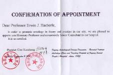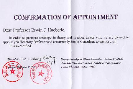 Am 10. September hielt ich dann vor ca. 150 Ärzten im Krankenhaushörsaal zwei Vorträge von je 120 Minuten - morgens zum Thema "Sexuelle Funktionsstörungen und ihre Behandlung"; nachmittags über die "Geschichte der Sexualwissenschaft". Beide wurden sehr dankbar aufgenommen, ja, zu meiner völligen Überraschung erschien der Präsident und überreichte mir unter allgemeinem Beifall eine Ernennungsurkunde zum "Honorary Professor and Senior Advisor". Dabei gab er der Hoffnung Ausdruck, daß sich zwischen uns eine fruchtbare Zusammenarbeit entwickeln möge. Hefei (11. September) Mit dem Klinikbus von Dr. Li fuhren wir nach Hefei zurück, wo ich abends noch ein Radio- und ein Zeitungsinterview gab ("Hefei Abendzeitung" Aufl. 800 000). Nanjing (12. -15. September) Am 12. September fuhr ich mit regulärem Linienbus in etwa drei Stunden nach Nanjing, wo ich zum Vortrag am "Nanjing College for Population Programme Management" eingeladen war. Wie sich herausstellte, hatte dieses sehr erfolgreiche, schnell expandierende College ein eigenes, neues, großes Gästehaus nach dem Standard eines westlichen Dreisternehotels, wo ich auch wohnte. Ich wurde vom Vizepräsidenten Prof. Sun Xiaoming und vom Leiter der Abteilung "Internationale Beziehungen", Prof. Huang Sen, empfangen. Beide sprachen fließend Englisch. Das College war völlig auf Studenten aus dem In- und Ausland eingerichtet und arbeitete sowohl mit den Instanzen der nationalen Familienplanung wie mit denen der UNO zusammen. Es lag sehr verkehrsgünstig und landschaftlich reizvoll zwischen Stadtzentrum und einem bewaldeten Hügelkomplex, wo sich die berühmten historischen Observatorien und das Grabmal von Sun Yat Sen befinden. Wiederum wurde mir eine Dolmetscherin zur Verfügung gestellt, die mich auf Wunsch überall hin begleitete und alle Taxifahrten bezahlte. Der 13. September war verschiedenen Besichtigungen gewidmet (Altstadt, Konfuzius Tempel, Sun Yat Sen's Wohnung und Arbeitsstätte, Grabmal, Observatorien usw.). Am 14. September hielt ich morgens im College vor Teilen des Lehrkörpers einen Vortrag von über drei Stunden zum Thema "Sexologie im Internet". Dabei nutzte ich, der Einfachheit halber, eine CD ROM unseres Archiv-Websites. Dieser Vortrag fand großen Anklang und rief eine lebhafte Diskussion hervor. Ich wurde gebeten, dem College zu bald wie möglich 20 solche CD ROMs für Unterrichtszwecke zuzuschicken. Unter den Zuhörern war auch Prof. Chu von der Universität Nanjing, der 1992 dort mein Gastgeber gewesen war und 1998 unser Archiv in Berlin besucht hatte.