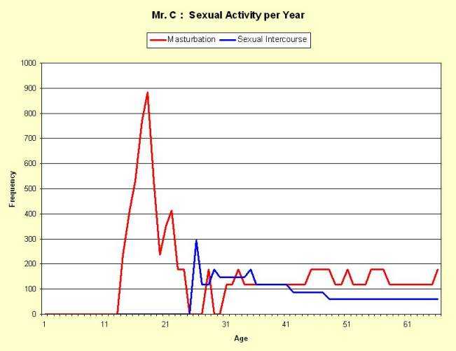 The Archive has acquired another sexual diary, this one spanning 53 years. The author, Mr. C., a retired industrial manager, is now 67 years old. He lives in a European country, is still married to his first wife and has two grown children. The diary consists of a 30-page narrative and three statistics: Frequency of maturbation, frequency of marital intercourse, and preference for coital positions. We have combined the first two of these statistics and converted them into the graph shown below.