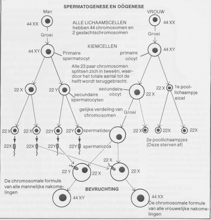In dit schema ziet men eerst hoe de produktie van mannelijke en vrouwelijke geslachtscellen verloopt en vervolgens welke de mogelijkheden zijn na bevruchting. 1. Spermatogenese en oögenese Uit één primaire spermatocyt kunnen uiteindelijk vier rijpe zaadcellen ontstaan, uit één primaire oöcyt slechts één eicel. De minuscuul kleine pool- lichaampjes die tijdens het proces van oögenese ontstaan, sterven af en vallen uiteen. (Zie ook blz.: 39 en 49). 2. Bevruchting Alle rijpe eicellen dragen een X-chromosoom, de zaadcellen dragen een X-chromosoom of een Y-chromosoom. Uit de versmelting van een zaadcel met een eicel kunnen dus twee soorten nieuwe cellen ontstaan: de XY-combinatie, uitgroeiend tot een jongen, of de XX-combinatie, uitgroeiend tot een meisje.