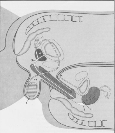 1. Testikel 2. Zaadstreng 3. Zaadblaasje 4. Prostaat 5. Urethra 6. Geloosd zaad 7. Baarmoederhals
