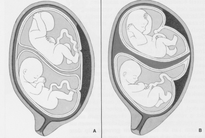 A. Eenefige tweeling. De foetussen hebben hetzelfde geslacht en delen samen één placenta. De twee vruchtwa- terzakken zijn door één vlies omgeven. B. Tweefige tweeling. De foetussen kunnen van geslacht verschillen. Er zijn twee placenta’s en twee afzonderlijke vruchtwaterzakken, elk met een eigen vlies.