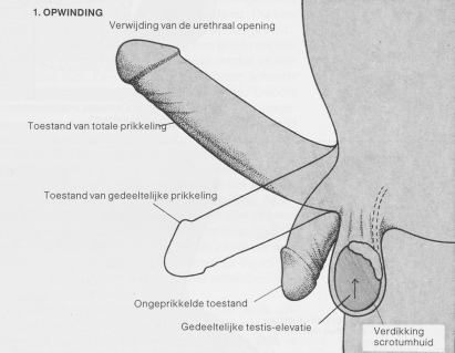 Hier wordt in vier afbeeldingen de seksuele respons van de mannelijke geslachtsorganen volgens Masters en Johnson weergegeven. In feite is het gehele lichaam bij deze respons betrokken. (Zie voor een uitgebreide beschrijving de voorgaande tekst).