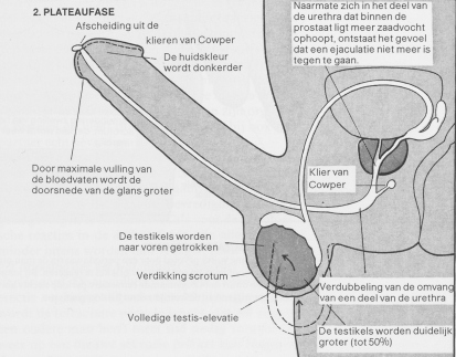 De plateaufase is in feite niet meer dan een voortzetting van de opwindingfase. Het woord plateau Wordt gebruikt om aan te geven dat de opwinding een bepaald niveau heeft bereikt dat tot het moment van orgasme gehandhaafd blijft. Als de seksuele opwinding eenmaal in dit stadium is geko- men, is de man niet gemakkelijk meer af te leiden, maar gaat hij geleidelijk aan steeds minder letten oP wat er in de omgeving gebeurt. Naarmate de seksuele prikkeling toeneemt wordt de spierspan- ning in het gehele lichaam groter, zowel de gewilde ^Is de spontane spierspanning. Ondertussen wordt de hartslag steeds sneller, blijft de bloeddruk stijgen en gaat de ademhaling steeds vlugger, ydens de plateaufase doen zich aan de penis zelf - le nu in erectie is - geen veranderingen van bete- enis voor. Maar de testikels zwellen duidelijk op fn worden dicht tegen de buik aangetrokken. De ulbourethrale klieren (de klieren van Cowper) scheiden enkele druppels helder vocht af die aan et uiteinde van de penis kunnen verschijnen.