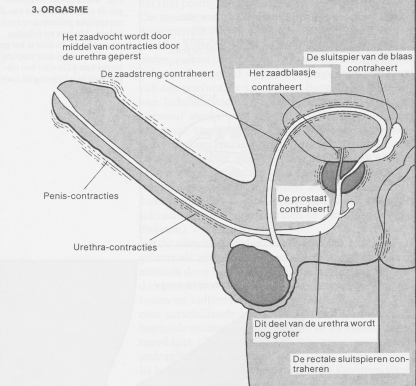 De samentrekkingen van de geslachtsorganen en het ejaculeren van zaad zijn de meest opvallende kenmerken van een orgasme. Maar ook de rest van het lichaam doet aan het orgasme mee. De sluitspieren van de anus trekken bijvoorbeeld tegelijk met de bovengenoemde organen ritmisch samen. In feite is er voor het orgasme in het gehele lichaam een geweldige spierspanning. Ademhaling en hartslag raken sterk versneld en ook de bloeddruk wordt nog hoger dan in de plateaufase. Het orgasme bestaat hieruit dat deze algehele spanningstoe- stand plotseling, in een aantal samentrekkingen, tot ontlading komt. De zaadlozing is bij dit hele gebeuren niet meer dan een bijkomstigheid. Orgasme en ejaculatie zijn twee verschillende processen. Hoewel voor mannen geldt dat ejaculeren zonder orgasme niet mogelijk is, kan een man heel goed een orgasme hebben zonder ejaculatie. Het duidelijkste voorbeeld hiervan is het orgasme van jongens vóór de puberteit. Hun inwendige geslachtsorganen zijn nog niet genoeg ontwikkeld om zaad te maken en dus valt er niets te ejaculeren. Maar jongens kunnen wel een orgasme krijgen.