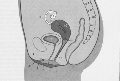 1. Venusheuvel 2. Grote schaamlip (één van een paar) 3. Kleine schaamlip (één van een paar) 4. Clitoris of kittelaar 5. Urethraal opening 6. Blaas 7. Vaginaal opening 8. Vagina 9. Cervix (baarmoederhals) 10. Uterus (baarmoeder) 11. Eileider (tuba: één van een paar) 12. Eierstok (ovarium: één van een paar)