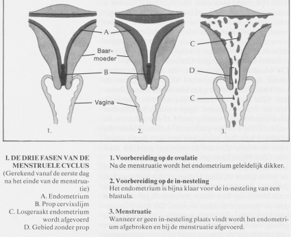 In medische handboeken wordt de menstruele cyclus gewoonlijk in twee, drie, vier, of meer verschillende fasen ingedeeld. Zo’n indeling blijft weliswaar altijd een ietwat willekeurige zaak, maar verschaft toch een inzicht in de biologische processen die zich afspelen. Voor ons doel lijkt een indeling in drie fasen voldoende.
