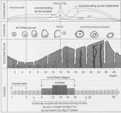 (Gerekend vanaf de eerste dag van de menstruatie) FSH: Follikel-stimulerend-hormoon; E: Oestrogeen; LH: luteïniserend hormoon; P: Progesteron. N.B.: Binnen 24uur nadeovulatie is er een sterke stijging van het progesteron gehalte.