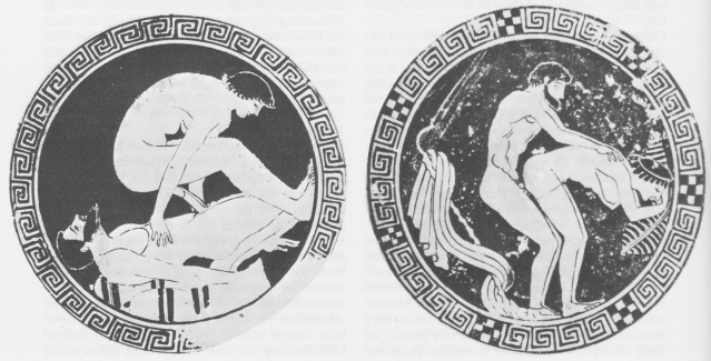 De oude Grieken en Romeinen hielden het niet bij één coïtushouding. Maar de voorkeur gaven zij toch doorgaans aan een houding met de vrouw bovenop de man. Op de drie vaasschilderingen enkele typerende variaties.