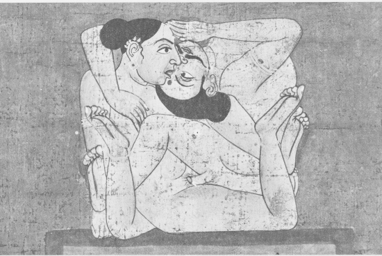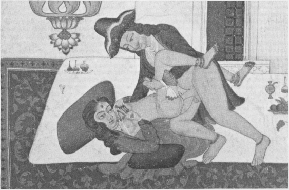 (Boven) Indiase kunstenaars schilderen vaak hele reeksen gecompliceerde coïtushoudin- gen. Op deze 18e eeuwse afbeelding wel een zeer ingewikkelde houding. We moeten er rekening mee houden dat de kunstenaars hun fantasie hebben laten werken en dat niet alle afbeeldingen in de praktijk uitvoerbaar hoeven zijn.