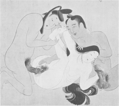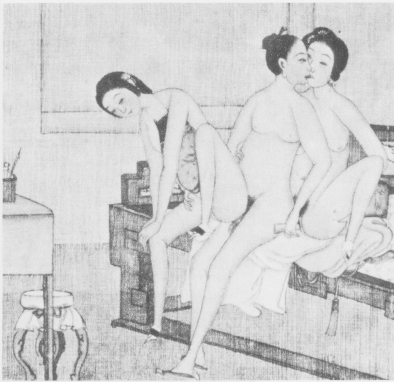 (Boven)Tafereel uit een prentenboek met daarop drie sex bedrijvende mensen. De middelste figuur gebruikt een kunstpenis. (Late Ming-dynastie)