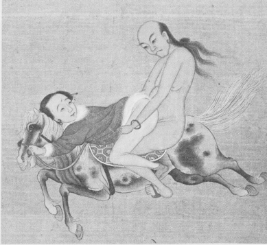 (Onder) Een ongewoon beeld van seksueel geweld uit een prentenboek waarin de seksuele avonturen van Mongoolse ruiters staan afgebeeld. (Late Ming-dynastie)