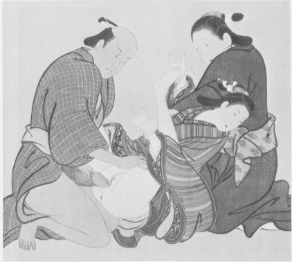 (Boven) Rolschildering van een vrouw die met twee mannen tegelijk vrijt.