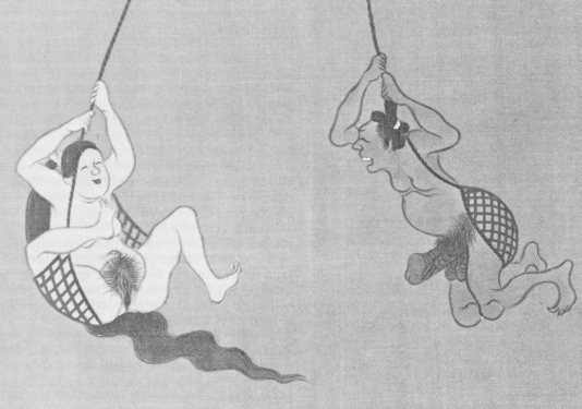 Op veel Japanse rollen wordt sex afgebeeld als een hartstochtelijk en zelfs agressief gebeuren. Japanse kunstenaars gaven de mannelijke geslachtsorganen meestal sterk vergroot weer, hetgeen ze er enigszins afschrikwekkend uit deed zien.