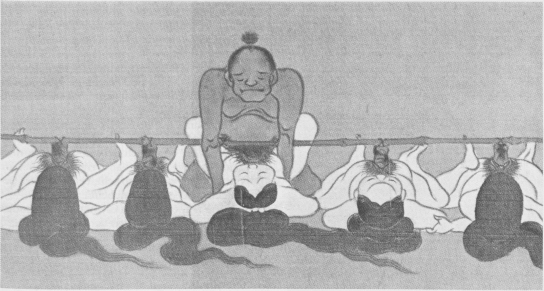 Taferelen van een door Katus- hika Hokusai(1760-1849) humoristische beschilderde zijden rol.