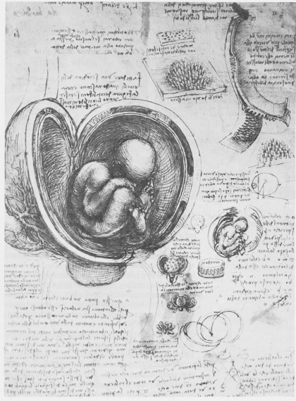 Twee bladzijden uit de aantekeningen van Leonardo da Vinci met anatomische studies van de coïtus en de foetale ontwikkeling (rechts).