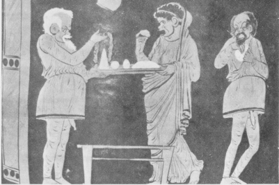 OPENBARE SCHENNIS VAN DE EERBAARHEID ‘Pornografisch vermaak’ is niet iets van onze tijd. In Europa dateren de eerste opzettelijk obscene voorstellingen uit de klassieke oudheid. Zo’n 250 jaar geleden woonde de Europese adel dergelijke voorstellingen bij in eigen privétheatertjes. (Boven)Tafereel uiteen Griekse komedie. De acteurs droegen grote kunstpenissen (phalloi). (Schildering op oud Grieks aardewerk). (Midden) Titelpagina en rolverdeling van een 17e eeuwse komedie. (Moderne herdruk). (Onder) Privévoorstelling in een 18eeeuws hoftheatertje.