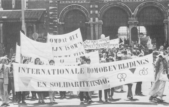 Beeld van een demonstratieve tocht door Amsterdam, gehouden door enkele duizenden betogers tijdens de landelijke strijddag voor homoseksuelen.