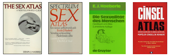(von links) The Sex Atlas von E. J. Haeberle erschien zuerst 1978 in New York. Eine holländische Übersetzung ”Spectrum Sex Atlas“ folgte 1981 in Utrecht, eine deutsche Übersetzung “Die Sexualität des Menschen” 1983 in Berlin, und eine türkische Übersetzung “Cinsel Atlas” 1985 in Istanbul.